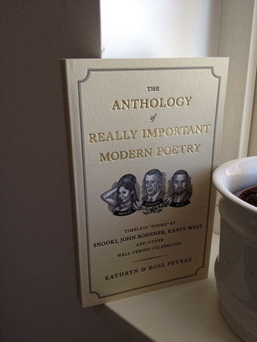 Nu är jag tillbaka från Berlin! Det enda jag har läst under min lilla minisemester är kurslitteratur… Men en av de två saker jag har shoppat till mig själv under resan är faktiskt just en bok: The Anthology of Really Important Modern Poetry. Jag har haft ett bra flyt i poesiläsningen, fram till någon månad sedan, när jag kom av mig lite med min Tranströmersamling. Den här boken, som alltså innehåller ”poesi” från kända hiphopare, t.ex. Kanye West, ska nog bli lite lättare att ta sig igenom.. Framför allt tyckte jag att den var snygg och rolig att ha. 🙂