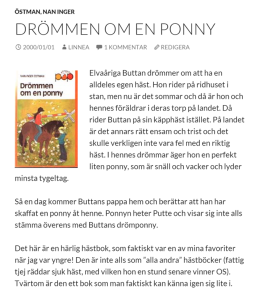 I dagens nostalgitorsdag tittar jag tillbaka till en bok som jag recenserade för typ 15 år sedan, nämligen Drömmen om en ponny. Det var dock inte första gången jag läste boken, för liksom som så ofta i den åldern så lästes varje bok om och om igen. Det fina med just Drömmen om en ponny är och var att den inte handlar om någon direkt drömponny, utan en ganska besvärlig och envis rackare. Boken är en skön motvikt till mycket annat i genren, som handlar om diverse topphästar och hittehästar och annat som förmodligen står långt ifrån verklighetens upplevelser för medelhästtjejen…