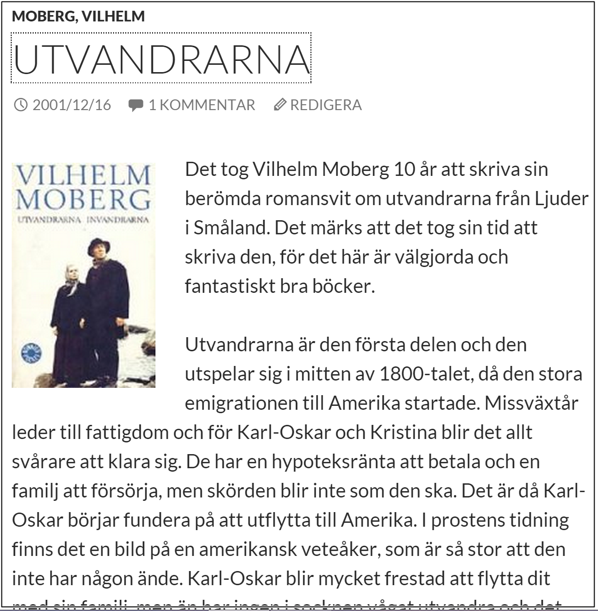 I dagens nostalgitorsdag dyker jag ner till 2001 och en av mina favoritböcker: Utvandrarna. Jag var då 14 år och gick på högstadiet. Boken var en av alla böcker vi var tvungna att läsa i skolan, men till skillnad från det mesta bland de påtvingande böckerna så älskade jag verkligen den här! Både Utvandrarna och de övriga böckerna i serien är otroligt läsvärda, även för en 14-åring, tydligen. Ärligt talat vet jag ingen som inte fastnat för de här böckerna. Böckerna har allt: gripande öden, ett stycke intressant historia, fina karaktärer. Och så är de bra skrivna, när man väl har vant sig vid dialekten, vilket jag vill minnas att man gjorde tämligen omedelbart.