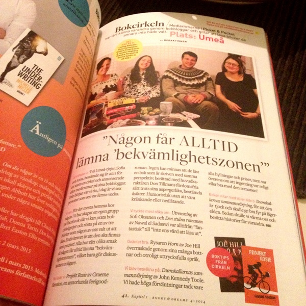 I varje nummer av tidningen Books & dreams är det en liten intervju med en bokcirkel. Min bokcirkelkamrat Anna, med näsan i en bok, fixade så att vår bokcirkel, Picket & pocket, fick vara med i decembernumret. Roligt! Tyvärr var det en ganska mörk oktoberkväll som vi samlades för att fota oss.. Inte ens Nobelprisprojektets proffsiga kamera kunde få till skarpa och bra bilder i det begränsade ljuset i min lägenhet.. Men! Vi var glada ändå! Och de har lyckats ljusa upp bilden så bra man kan, tror jag. 🙂 Vill någon spana in exakt hur glada vi var så finns det alltså bildbevis i Books & dreams vinternummer. Där avslöjar vi även vilka böcker vi tyckt mest olika om och vilka böcker som överraskat oss mest.
