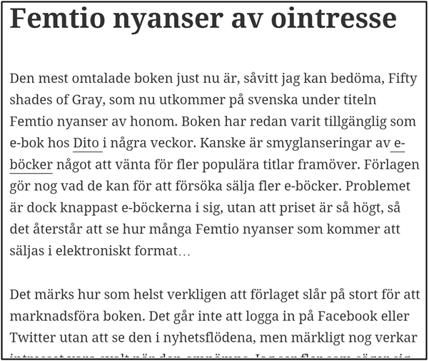 Sedan lanseringen har det förresten kommit ut speciella klädkollektioner, sällskapsspel m.m. med Femtio nyanser-tema. Och nu i februari kommer filmatiseringen på bio. Jag kan tänka mig att betala för att slippa se. 😉