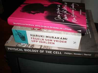 Den senaste tiden har jag också fått en intressant ljudbok om en ung kvinna som kommer till Sverige efter Andra världskriget och en ungdomsbok med titeln Söta pojkar är bara på låtsas (väldigt tonårig titel! Jag hoppas/tror att den återupplivar minnen av hur livet var på den tiden). Jag har också av eget intresse köpt en fet fackbok om fysikalisk cellbiologi (oväntat tråkig! Hur kan man göra en bok med ball-and-stick-modeller i gråskala?!) och, helt crazy, en supertjock bok av Murakami! Jag gillar ju inte ens Murakami? Hur tänkte jag? Vet ej. Den blir nog inte läst på ett tag…