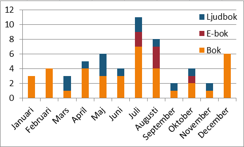 Jag har läst flest pappersböcker, men läsplattan har också använts, särskilt i somras. En del böcker har jag läst på både platta och som pappersbok och då har jag räknat dem som pappersbok i statistiken. Ljudböckerna har varit riktigt många, särskilt i våras, då jag sprang mycket inför de två lopp jag sprang i maj och juni, och på sommaren och semestern såklart.