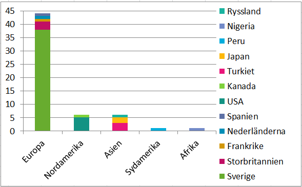 Det har inte varit särskilt stor spridning i ursprungsland i år och det får jag nog till viss del skylla på bloggen ;), för anledningen är bland annat att jag har fått en del recensionsexemplar och de är ju från svenska författare. Till nästa år får jag nog rycka upp mig och läsa lite mer från icke-europeiska länder, kanske framför allt Ocenaien, som inte är representerat alls i år. Jag har bara räknat ett land per författare. En del författare hör ju egentligen till flera land, t.ex. spansk-peruanske författaren Mario Vargas Llosa, som jag tog mig friheten att peta in bland peruanska författare den här gången.