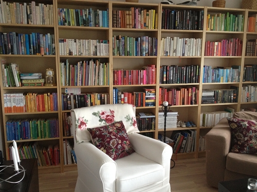 1. Tack. 🙂 Färgkoordinerat är det bästa.. Så länge man inte vill hitta tillbaka till böcker man har placerat där.. 😉