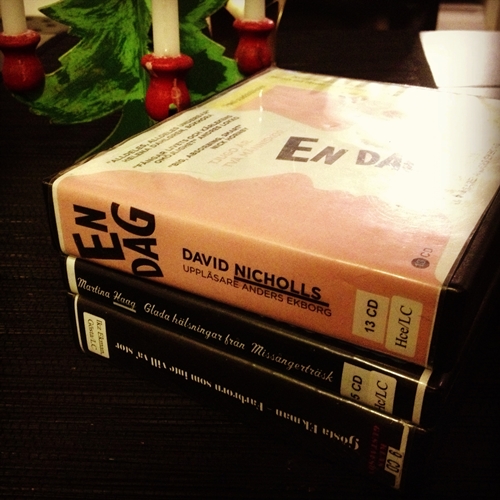 Lagom till mitt lilla ”jullov” passade jag på att svänga förbi bibblan för att låna några nya ljudböcker. Jag brukar aldrig ha tittat ut någon speciell titel i förväg, dels för att utbudet inte är så himla stort och dels för att de titlar som finns är så flitigt utlånade att det inte är så troligt att just det man vill läsa finns inne… Den här gången tyckte jag dock att det blev riktig jackpott! En dag, som jag har velat läsa så länge! En ny av fantastiska Martina Haag! Och som en bonus, Farbrorn som inte vill va’ stor. Det här ser jag fram emot att lyssna på.