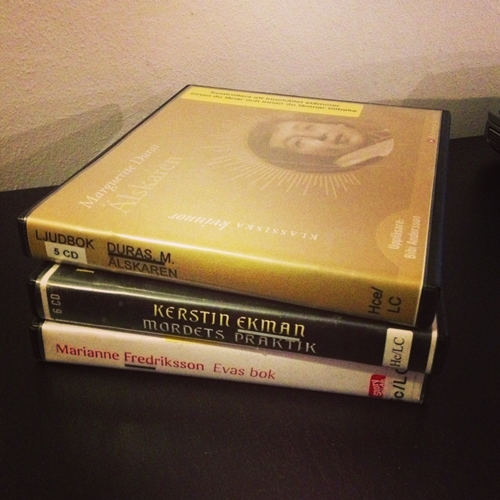 Jag planerar att börja springa igen inom kort, så nu har jag laddat upp med ett gäng nya ljudböcker. Jag lyssnar ju mest när jag springer (och när jag hänger tvätt, men det inträffar inte särskilt ofta, hehe). Jag ser särskilt fram emot att lyssna på Marguerite Duras Älskaren. De andra böckerna känner jag inte till särskilt väl, men jag tänkte att det var dags att läsa något mer av Marianne Fredriksson nu, så jag lånade Evas bok. Mordets praktik, av Kerstin Ekman, handlar, om jag har förstått det rätt, om Doktor Glas (en av världens bästa böcker!). Otroligt vad många böcker det har kommit ut som kretsar kring Doktor Glas.. Men det är väl fler än jag som fascineras av Hjalmar Söderberg. Helt enkelt.